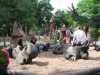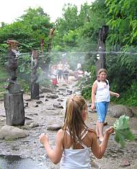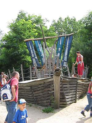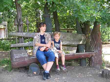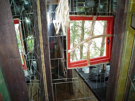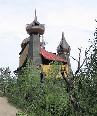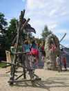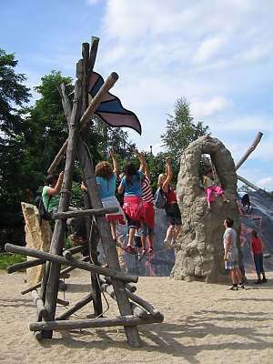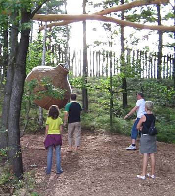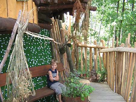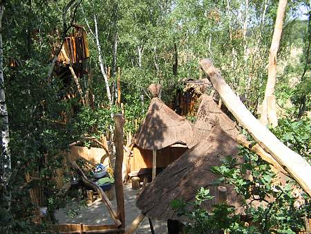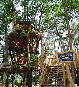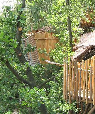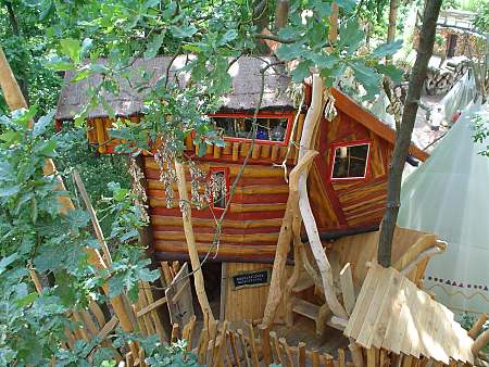 Ich bin nicht hier, um die Natur zu beherrschen oder sie auszubeuten. Ich bin selbst Natur. Baumhaushotel auf der Kulturinsel EinsiedelDie Anlage Am äußersten Ende Deutschlands, direkt an der polnischen Grenze in Neißeaue/Zentendorf, entstand eine ungewöhnliche Spielidee mit Übernachtungsmöglichkeit, die von Jürgen Bergmann und seinen Künstlern geschaffen wurde.Es begann 1990 mit künstlerisch gestalteten Objekten zum Betrachten. Daraus wurden Sitzgelegenheiten und Gegenstände zum Spielen für Kinder. Doch auch Erwachsene klettern gerne und so entwickelte sich nach und nach die Idee einer Abenteuer-Erlebniswelt für die ganze Familie - ganz nach dem Anfangs-Motto: "Wir bauen große verrückte Sachen aus Holz". Mittlerweile arbeiten fast 60 Menschen - vom Holzfäller bis zum Künstler - in Jürgen Bergmanns Team, denn die Aufträge zum Bau der einzigartigen Abenteuerinseln kommen aus ganz Europa. Große Firmen und Städte erhalten vom Team der Kulturinsel Einsiedel maßgeschneiderte Kletter- und Spielplätze, meist aus natürlichen Materialien gefertigt und aufgebaut. Markenzeichen der Firma ist der vorwiegende Einsatz von langlebigen, unbehandelten Eichen- und Robinienkernhölzern, die direkt auf der Kulturinsel verarbeitet werden. Dabei handelt es sich bei jedem der gefertigten Objekte um Einzelstücke, die der potentielle Kunde vorher in einem kleinen Modell von allen Seiten begutachten kann. Anders als bei anderen Bauprojekten werden keine Zeichnungen angefertigt, sondern einzig und allein das Modell dient den Handwerkern als Vorlage für den Bau der Großgeräte. Doch nicht nur die Materialien, sondern auch die Umsetzung vom Traum eines wilden Abenteuerlandes in die dörfliche Umgebung des Ortes Neißeaue/Zentendorf, zeugt von viel Kreativität und Ideenreichtum. So können Kinder z. B. im Käselabyrinth in die Unterwelt eintauchen und sich durch 500 Meter lange Röhren vorbei an unterirdischem U-Boot Nautilus durch den ganzen Park bewegen. 46 Ausstiegslöcher sind überall auf der Kulturinsel verteilt. Das unterirdische Irrgartensystem ist zwar nur für gelenkige Erwachsene geeignet, weil die Röhren oft nur hüfthoch sind, aber dafür können weniger bewegliche Nicht-Kinder an vielen anderen Orten wie dem Geisterschloss, der Teufelsbrücke oder dem Wikingerschiff an großen Seilnetzen hochklettern, durch Drahtröhren in 10 Meter Höhe kriechen, sich über schmale oder wackelige Brücken hangeln oder einfach ein wenig in der Riesenschaukel abhängen.Es gibt jede Menge Einzigartiges und Neues zu erleben und zu bestaunen - raffinierte Spielideen, die das Kind im Erwachsenen wieder zum Leben erwecken. Und genau das ist das Ziel der Kulturinsel Einsiedel. Eine weitere Besonderheit zeigt sich beim Essen in diesem etwas anderen Vergnügungspark. Bratwurst und Pommes sucht man hier vergebens. Stattdessen werden liebevoll zubereitete Gerichte mit fantasievollen Namen angeboten, die Lust aufs Schlemmen machen. Wie wäre es mit russischen Pelmeli, Ungarngulasch Pußtafeuer, Beerenkruska, Karmoffeltuffer oder gar der "Scharfen Sau"? Gegessen wird in einer urigen, fast unterirdisch anmutenden Feuerschenke, natürlich mit offener Feuerstelle zum evtl. Selberbruzeln von Knüppelbrot oder Fleischspießen, was besonders Kindern die Zeit wie im Fluge vergehen lässt. ![]() Das Baumhaushotel Das Konzept der Kulturinsel ist durchgängig verwirklicht, von zu bestaunenden Kunstobjekten, die teilweise in Gebüschen versteckt stehen, über immer wieder neu zu entdeckende Spiel-Kletter-Kriech-Schaukel-Balancier-Objekten bis hin zu den kulinarischen Kreationen und neuerdings dem zur Gesamtidee passenden ersten Baumhaushotel Deutschlands in luftiger Höhe.