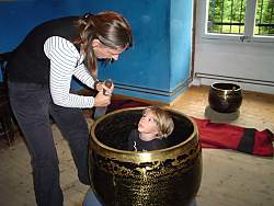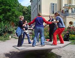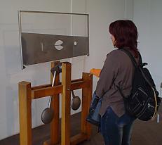 Die Hand ist das äußere Gehirn des Menschen Erfahrungsfeld der Sinne im Schloss Freudenberg in WiesbadenHistorieHugo Kükelhaus, der im Jahre 1900 geboren wurde, schrieb folgendes zum Thema Erfahrungen nieder: 'Es ist wie mit dem Küssen. ... Man muss es tun. Dann erst weiss man, was es ist. So verhält es sich auch mit dem Erfahrungsfeld..... Wir sind seit Jahrhunderten darin geübt, die Erfahrung durch die Kenntnis zu ersetzen. Und leben in einer Ersatzwelt. In der nichts anderes ersetzt wird als das Leben selbst, eben: die Erfahrung.' Getreu nach diesem Motto wurde ein Wanderausstellung zum Thema Erfahrungsfeld ins Leben gerufen, die nun im Schloss Freudenberg in Wiesbaden seßhaft ist.Obwohl diese Stätte der Wahrnehmung bereits seit 1993 der Öffentlichkeit zugänglich ist, drängt sich beim Besucher der Eindruck einer 'Baustelle' auf, was jedoch gewollt ist. Denn der Wiederaufbau und die Wiederbelebung des einstmals verfallenen Gebäudes wird als 'Erfahrungsfeld' und Lehrbaustelle inszeniert. Immer wieder wurden und werden Künstler, Pädagogen, Architekten, Handwerker und Kinder eingeladen, am Aufbau des Erfahrungsfelds Freudenberg mitzuwirken. Aus diesem Grund wurde der Verein als gemeinnützig anerkannt und erhielt für seine Verdienste für das kulturelle Leben in Wiesbaden den Kulturpreis der Landeshauptstadt. Fakten und Erkenntnisse Was genau aber ist nun im Schloss Freudenberg zu sehen und warum ist ein Besuch eine nachwirkende Erfahrung für jeden? Hier finden Sie 'Feldwege' zur Entdeckung, Erkundung und zum spielerischen Umgang mit all den Erscheinungen, die Himmel und Erde zusammenhalten. Dabei geht es nicht wie häufig in Ausstellungen um Betrachten und Konsumieren, sondern um selbst Erfahrungen zu machen. Vor dem Schloss finden sich u. a. ein Barfußweg, ein Summstein, diverse Geschicklichkeitsspielzeuge wie Laufrollen, Stelzen oder Wackelholzscheiben und vieles mehr. Erwachsene wie Kinder machen hier bei geeigneten Wetterbedingungen bereits erste Erfahrungen beim Berühren von unterschiedlichen Materialien oder dem Gebrauch unterschiedlichster Gegenstände. Alle Sinne werden angesprochen. Wer nicht nur zuguckt, sondern sich selbst auf das mitmachen einlässt, fühlt sich lebendig und aufgeladen, bereit zu neuen Taten. (Auch Managerschulungen finden hier statt.)Im Inneren des Schlosss geht es dann weiter. Namen wie Strömungstafel oder Wolkenmaschine, Impulskugelreihe, Riesen-Dreizeitenpendel oder Duftorgel machen neugierig. Hier erlebt man Geräusche, Klänge, Düfte, Dunkelheit, Licht und vieles mehr in ganz anderem Dimensionen und mit einem neuen Gefühl der Ganzheit. Real zu sehen Es ist schwer zu beschreiben, was genau Sie erleben werden, wenn Sie sich auf das Abenteuer 'Erfahrungsfeld' einlassen, denn nüchterne Beschreibungen helfen kaum weiter. Trotzdem hier nun ein kleiner Überblick über die vielfältigen Sinneswahrnehmungen, die Sie im Schloss Freundenberg erleben können. Draußen führt das Erfahrungsfeld Geomantie zu einem Ort der Kraft. Geomantie ist eine alte Wissenschaft von den Wechselbeziehungen zwischen Erde und Kosmos. Lassen Sie hier zum Beispiel einmal einen tonnenschweren Stein über sich hin und her pendeln, um die Gewalt der Natur zu erleben. Oder folgen Sie einem Stein-Labyrinth, dass bereits 500 Jahre v. Chr. in dieser Form gebaut wurde.Ebenfalls vor dem Schloss befindet sich der Barfußweg, der ganz neue Erfahrung für unsere schuhgewohnten Füße bietet. Anschließend sollten Sie einmal den Summstein ausprobieren, der eine Nachbildung eines unterirdischen Summlochs in Malta ist. Hören Sie hier Ihren ganz eigenen Tremor, etwas, was bei jedem Menschen einzigartig ist. Im Schloss begegnen Sie als erstes dem Thema Schwingungen. Alles kann und soll in Bewegung gebracht werden. Impulspendel, Dreizeitenpendel, Spiralzeichner, Strömungstafel ...Weiter geht es mit schwerer erfaßbaren Phänomenen, denn nun sind Geduld und Aufmerksamkeit nötig, da sich nicht alles auf den ersten Blick erschließt, bzw. die Phänomene von Station zu Station springen. Farbige Schatten, Goethes Farbenlehre Abendrot und Himmelsblau, die prismatischen Farben, farbige Nachbilder ... Besonders beeindruckend der dunkle Raum und die Dunkelbar, beides Räume ohne einen jeglichen Lichtstrahl - absolute Dunkelheit, durch die man sich durchkämpfen muss; über Stock und Stein geht es treppauf- und treppab. Und wer sich traut, gönnt sich einen Drink in der nachtschwarzen, lichtlosen Bar und sieht sich bei der Bezahlung ungeahnten Schwierigkeiten gegenüber. Wie geht eigentlich mein Portemonnaie auf ... komisch ... tausendmal gemacht ... und doch ... wie finde und entnehme ich die Münze ohne dass sie auf den Boden fällt. Und welche Münze habe ich hier eigentlich? Bereits in der Dunkelzone wird der Hörsinn gefordert. Ebenso beim Malen mit Tönen, wo durch Sand und Töne Klangbilder erzeugt werden. Probieren Sie auch die chinesische Tempelglocke mit ihren fast meditativen Klangsequenzen aus. Oder versuchen Sie wie die Priester und Schamanen früherer Zeiten durch den wassergefüllten Hexentopf in die Zukunft zu blicken. Diese Bronzeschale kann durch Reiben zum Klingen gebracht werden und erzeugt dabei verschiedene Muster auf der Wasseroberfläche.