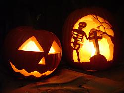 Jack O'Lantern nennt man den ausgehöhlten Kürbis mit Gesicht, der mal traurig, mal froh oder gruselig wirken kann. Traditionell wird er in den USA im Oktober an allen Ecken und Enden aufgestellt und im Dunklen mit einem Teelicht von innen beleuchtet.